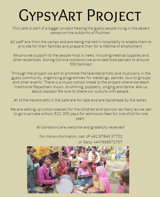 GypsyArt Project is a cafe/gallery tucked away in the back streets, run by gypsy musicians and artists, helping to support poor families in the desert camps on the outskirts of Pushkar.