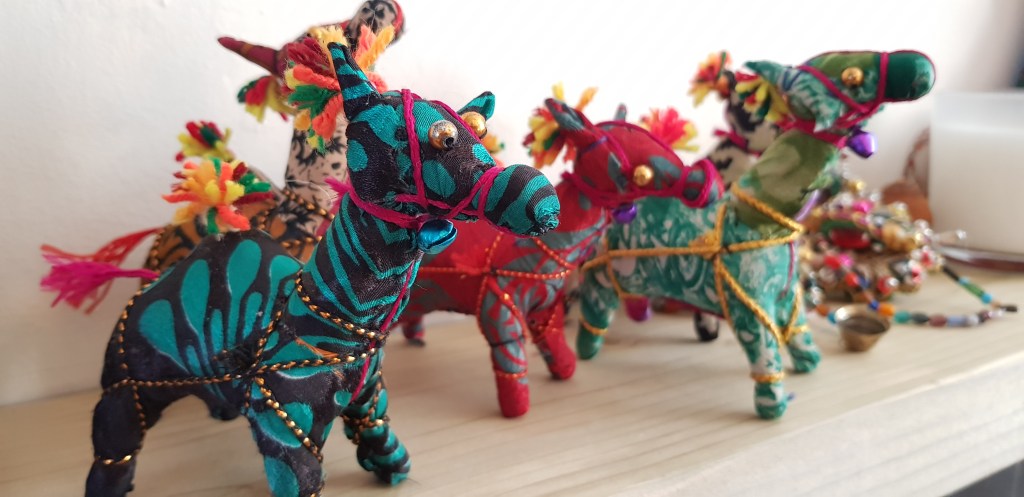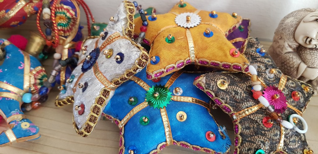 A selection of handicrafts for sale: Angels with flowing skirts like the Rajasthani dancers; handmade Christmas trees, stars and animals. Visit our Facebook for more details.