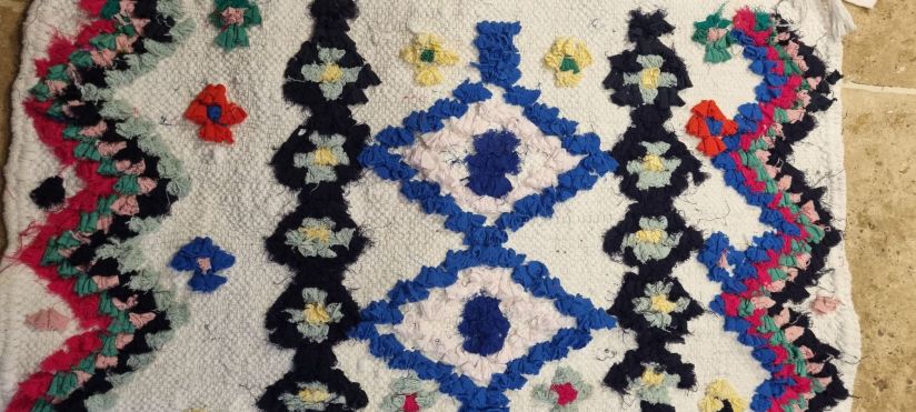 Families in the low Atlas mountains collect old clothes. They are washed and shredded ready for the women to weave into these bright rugs. They have a cotton base.